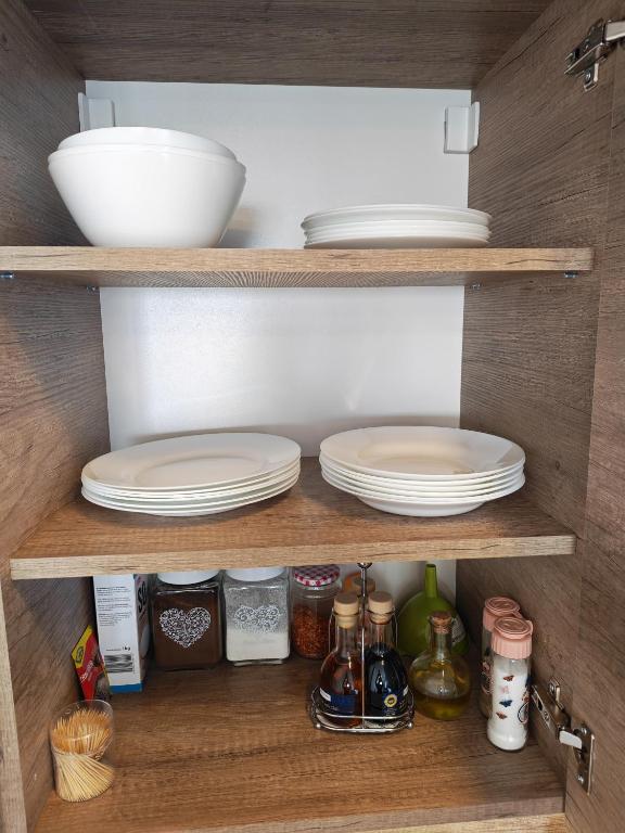 frižider, kuhinja, električno kuvalo, posuđe, ploča za kuvanje, aparat za kafu, sto za ručavanje, čaše za vino